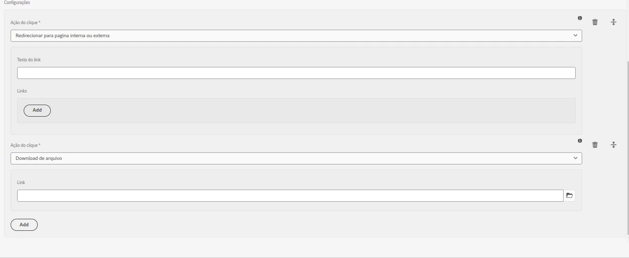 <multifield jcr:primaryType="nt:unstructured" sling:resourceType="granite/ui/components/coral/foundation/form/multifield" composite="{Boolean}true" fieldLabel="Configurações" > <field jcr:primaryType="nt:unstructured" sling:resourceType="granite/ui/components/coral/foundation/container" name="./multifield"> <items jcr:primaryType="nt:unstructured"> <column jcr:primaryType="nt:unstructured" sling:resourceType="granite/ui/components/coral/foundation/container"> <items jcr:primaryType="nt:unstructured"> <umbrelaMenu granite:class="cq-dialog-dropdown-showhide-multi" jcr:primaryType="nt:unstructured" sling:resourceType="granite/ui/components/coral/foundation/form/select" fieldDescription="Ação do clique" fieldLabel="Ação do clique" required="{Boolean}true" forceIgnoreFreshness="{Boolean}true" name="./umbrelaMenu"> <items jcr:primaryType="nt:unstructured"> <redirect jcr:primaryType="nt:unstructured" selected="{Boolean}true" text="Redirecionar para pagina interna ou externa" rootPath="/content/dam" value="redirect" /> <download jcr:primaryType="nt:unstructured" text="Download de arquivo" value="download" /> </items> <granite:data jcr:primaryType="nt:unstructured" cq-dialog-dropdown-showhide-target=".umbrelaMenu-showhide-target" /> </umbrelaMenu> <showFileLink granite:class="umbrelaMenu-showhide-target" jcr:primaryType="nt:unstructured" sling:resourceType="granite/ui/components/coral/foundation/well"> <items jcr:primaryType="nt:unstructured"> <linkTarget jcr:primaryType="nt:unstructured" sling:resourceType="cq/gui/components/coral/common/form/pagefield" fieldLabel="Link" rootPath="/content" name="./linkTarget" /> </items> <granite:data jcr:primaryType="nt:unstructured" showhidetargetvalue="download" /> </showFileLink> <actionTypeRedirectGroup granite:class="umbrelaMenu-showhide-target" jcr:primaryType="nt:unstructured" sling:resourceType="granite/ui/components/coral/foundation/well"> <items jcr:primaryType="nt:unstructured"> <linkLabel jcr:primaryType="nt:unstructured" sling:resourceType="granite/ui/components/coral/foundation/form/textfield" fieldLabel="Texto do link" name="./linkLabel" /> <multifieldLinks jcr:primaryType="nt:unstructured" sling:resourceType="granite/ui/components/coral/foundation/form/multifield" fieldLabel="Links" name="./linksUmbrela"> <field jcr:primaryType="nt:unstructured" sling:resourceType="granite/ui/components/coral/foundation/container"> <items jcr:primaryType="nt:unstructured"> <linkLabelUmbrela jcr:primaryType="nt:unstructured" sling:resourceType="granite/ui/components/coral/foundation/form/textfield" fieldLabel="Texto do link" name="./linkLabelUmbrela" /> <linkTargetUmbrela jcr:primaryType="nt:unstructured" sling:resourceType="cq/gui/components/coral/common/form/pagefield" fieldLabel="Link" rootPath="/content" name="./linkTargetUmbrela" /> </items> </field> </multifieldLinks> </items> <granite:data jcr:primaryType="nt:unstructured" showhidetargetvalue="redirect" /> </actionTypeRedirectGroup> </items> </column> </items> </field> </multifield>