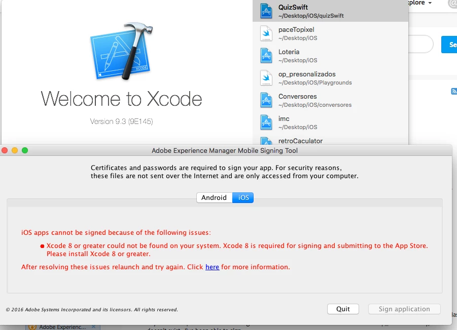 Here is the helpx link related to this subject - AEM Mobile signing tool shows "Xcode 8 or greater could not be found on your system"