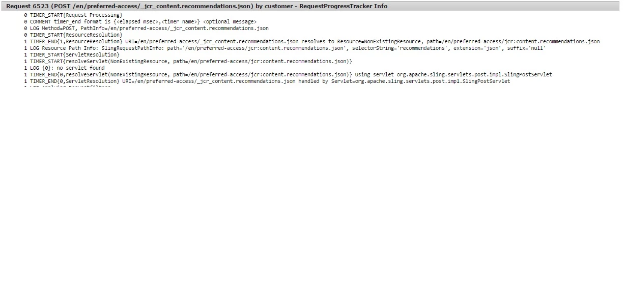 I have a Sling Servlet named RecommendationsServlet which is resolved for one user and un-resolved for the other. I have attached screenshots for both the requests from Felix. Only difference I see is that the request is processed as a customer for one user and full-customer for another in the felix console. Please help ASAP.