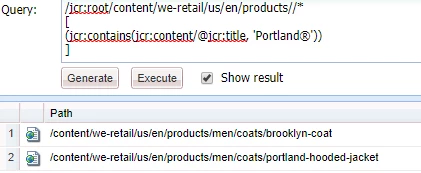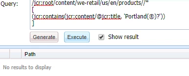 (jcr:like(jcr:content/@jcr:title, '%Portland®%'))