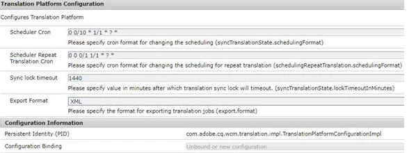 Is there a minimum/maximum value accepted for the Scheduler Cron expression used in the Translation Platform Configuration?