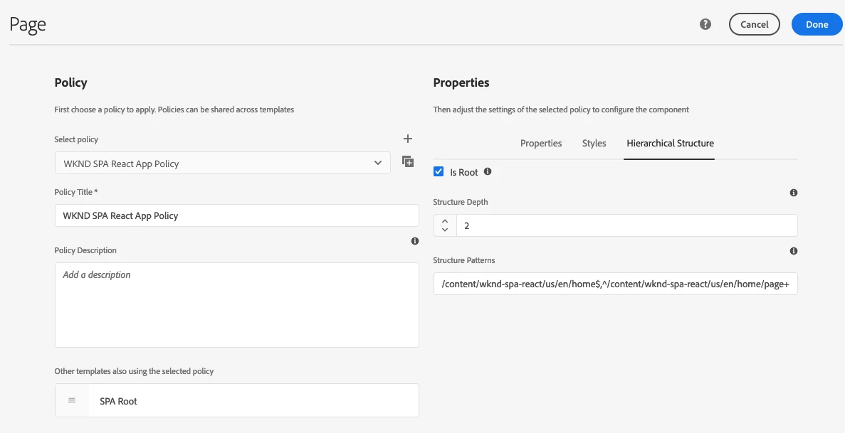 Structure Patterns is set to: ^/content/wknd-spa-react/us/en/home$,^/content/wknd-spa-react/us/en/home/page+