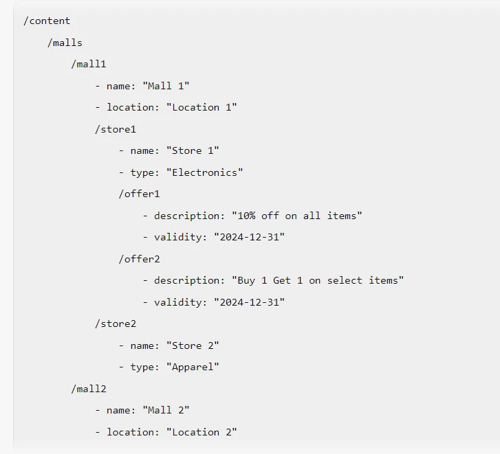 I am currently working on a project where I need to create a website using Adobe Experience Manager (AEM). The website is designed to represent multiple malls, with each mall housing numerous stores. Additionally, these stores will be providing various offers.