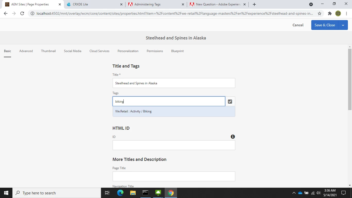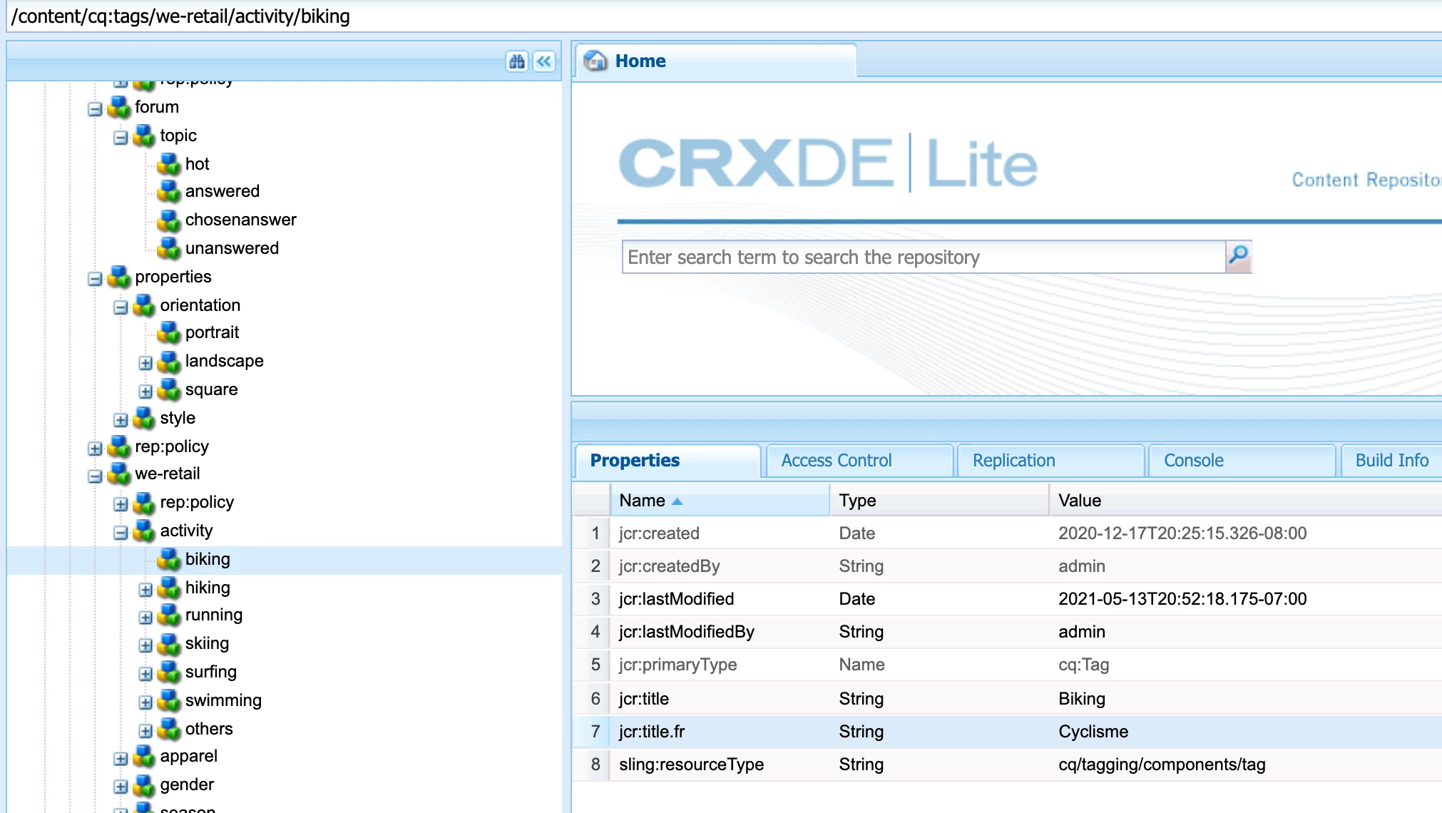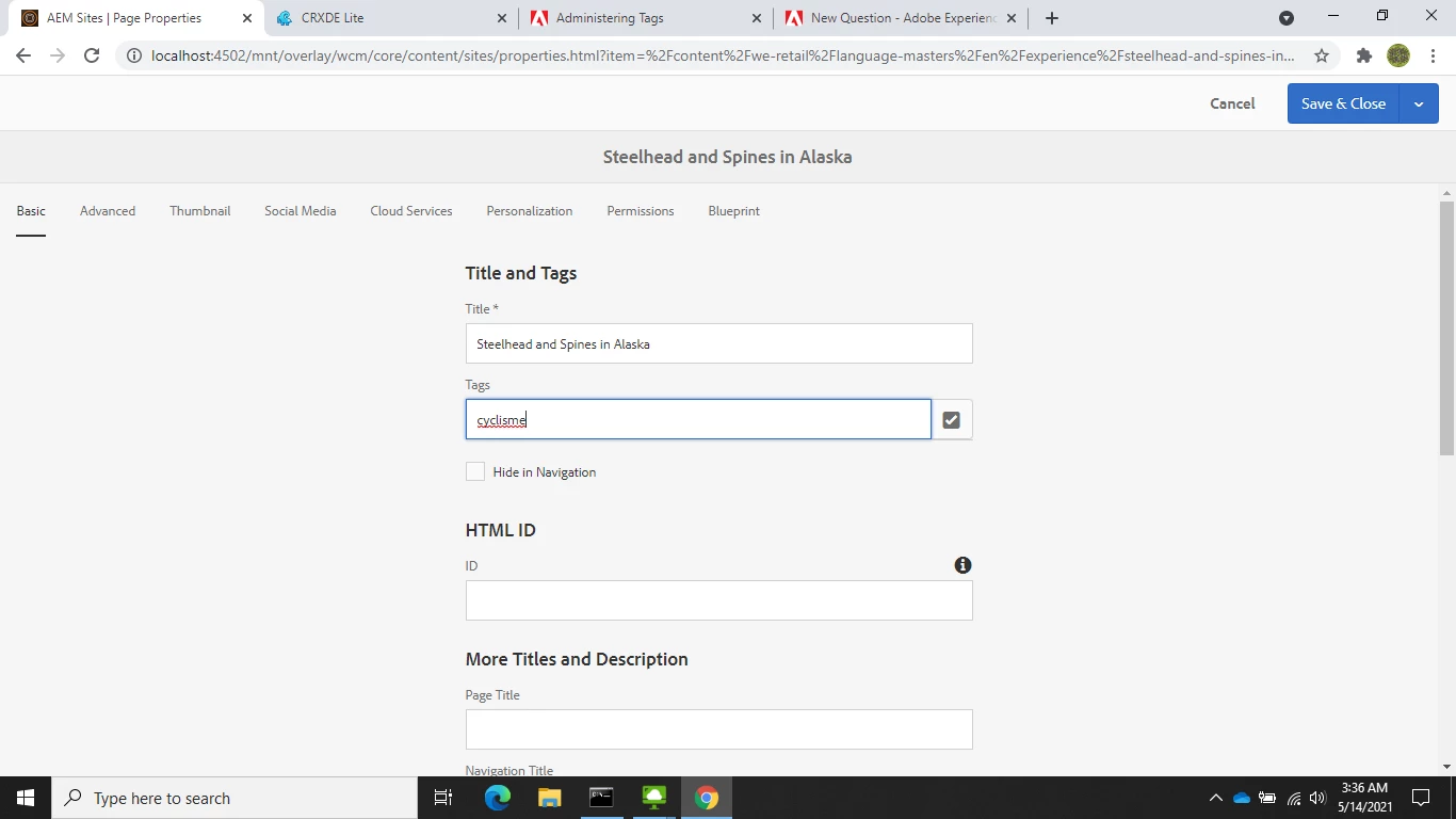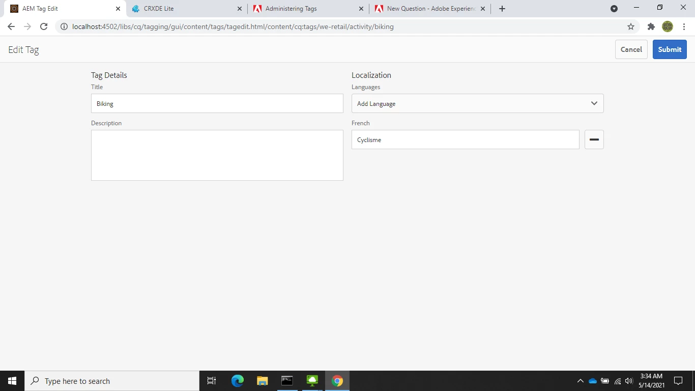 Hello i tried to add a tranlation to a tag Biking under we.retail project. I translated to French as Cyclisme