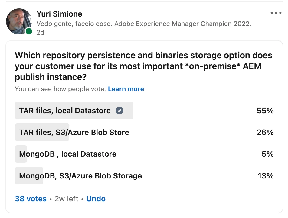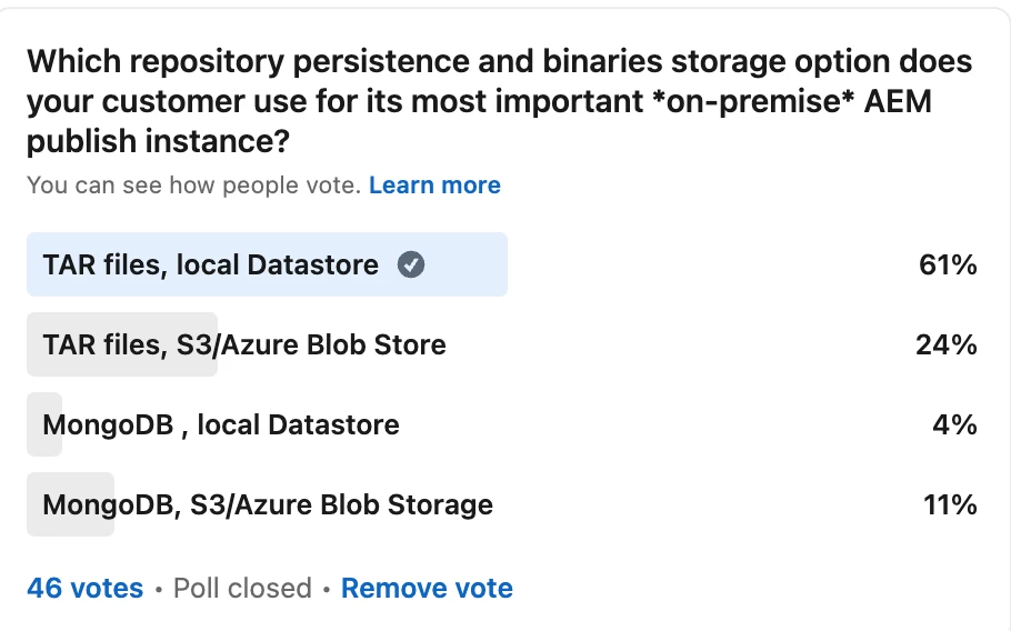I've started a poll on the most used persistence (for repository) and storage (for binaries) for AEM, on-premise, installations. Vote in the largest and most active LinkedIn group on Adobe AEM and Marketing Cloud Group on LinkedIn . I will update final results here. Right now these are the results: