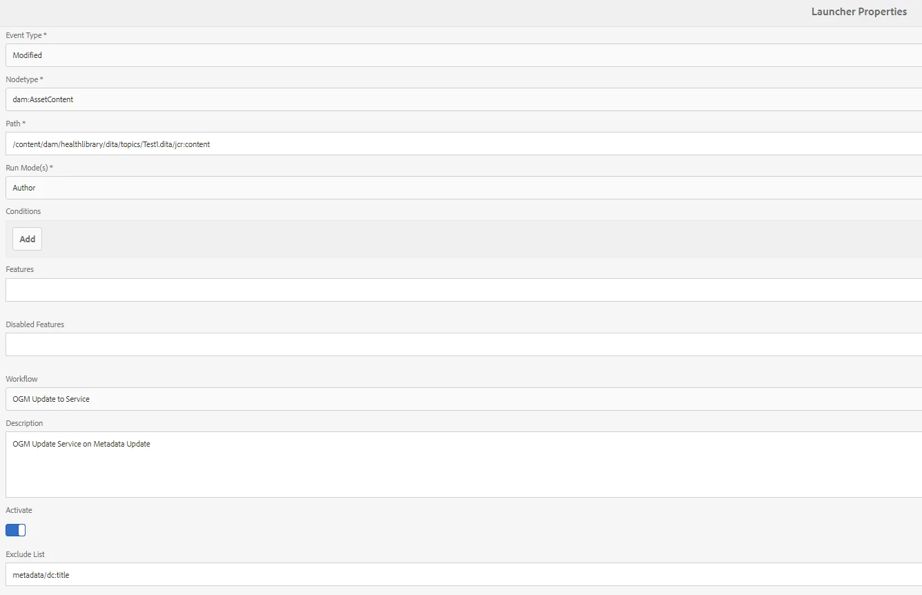 I am trying to create a custom launcher where a workflow will be triggered when only one specific property is updated. This does not seem to work and I don't know what I'm doing wrong.
