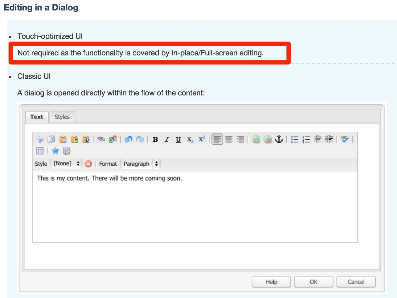 1. Assuming the above statement and what smacdonald2008 replied are the same thing, may I know if having more RTE plugin features (like what Touch UI In-place/Full-screen did) in Touch UI in Dialog editing is not what Adobe AEM going to support?