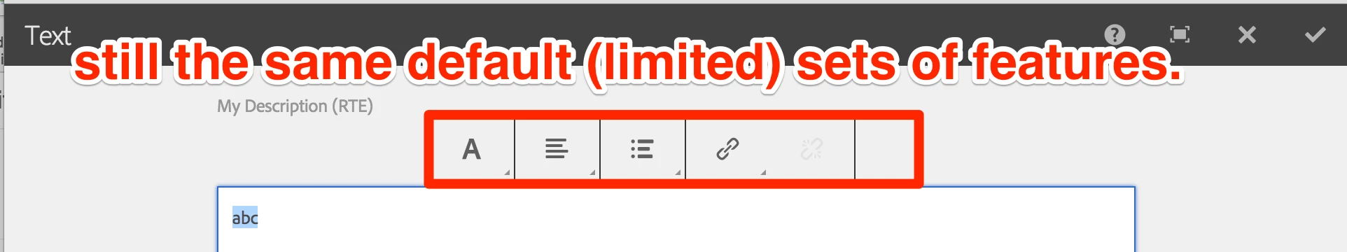 Now there's one issue I realised (below screenshot), there isn't a way to enable more RTE plugin's features as we always do in Classic UI. Or at least, I can't find any official tutorial / document available from Adobe.