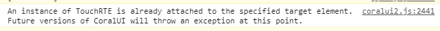 Instead, the console will give a message "An instance of TouchRTE is already attached to the specified target element. Future versions of CoralUI will throw an exception at this point."