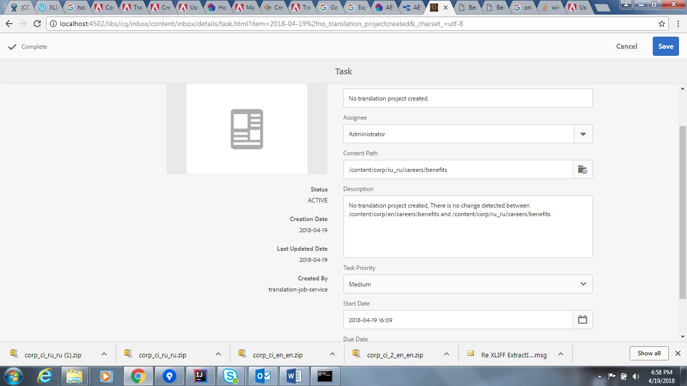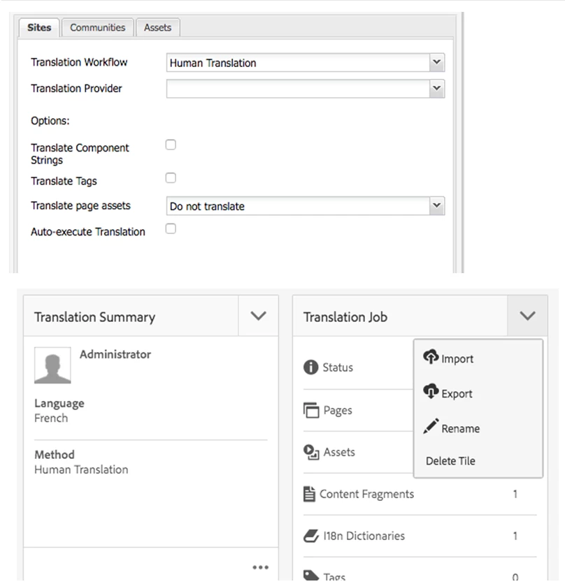 - Open the translation project, and in the Translation Job tile > dropdown, select Export (see bottom screenshot). This will download a compressed file to the local machine. This compressed file contains xml files and any asset files associated with the web pages that are included in the translation job.