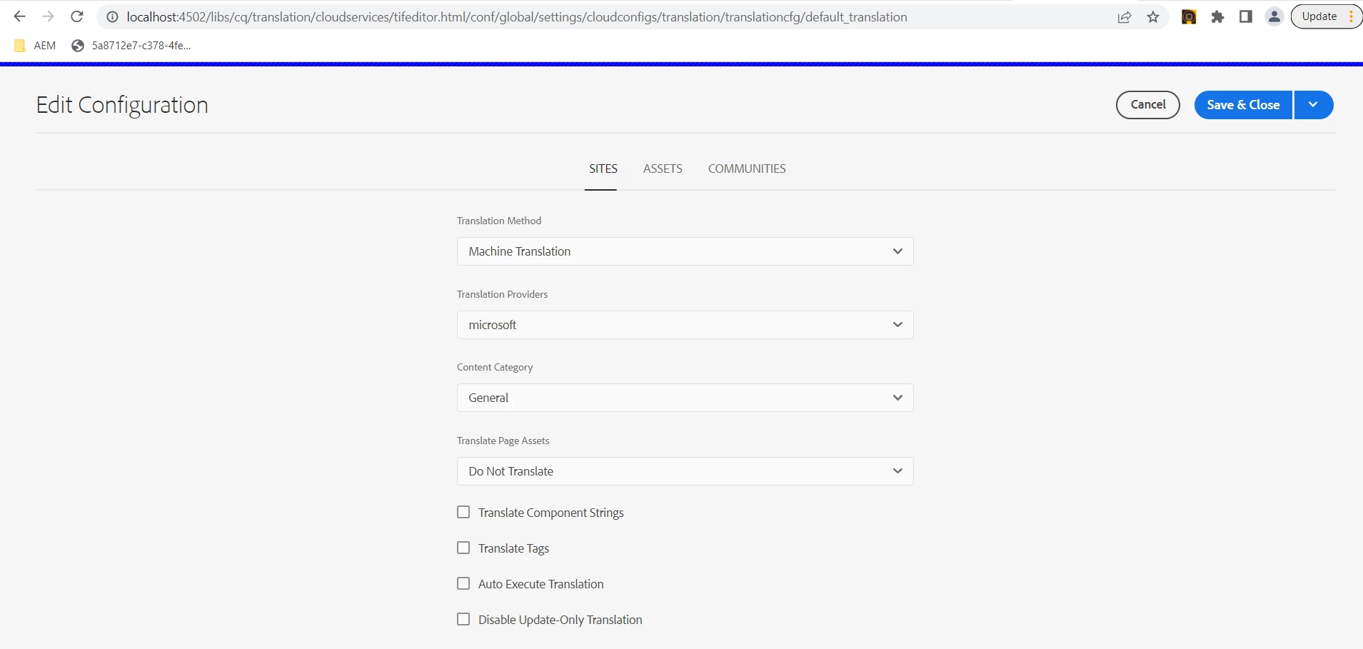 Translation Job fails on AEM local instance