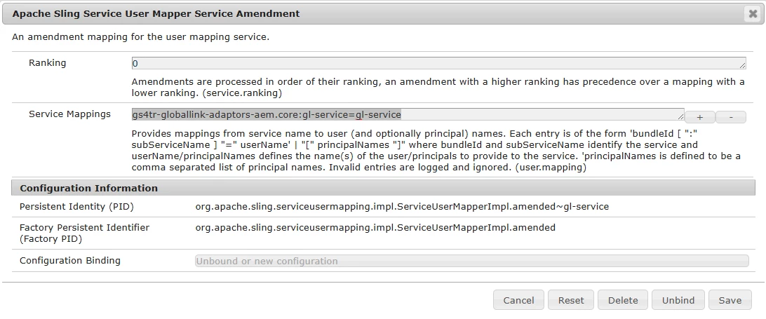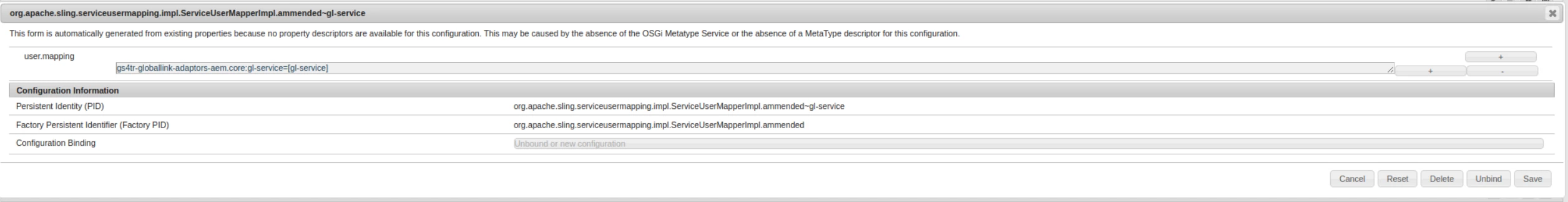 There, among the many Mappings that I have, is one that has this value: gs4tr-globallink-adaptors-aem.core:gl-service=gl-service