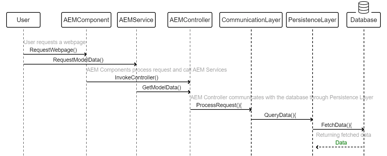 - AEM Components and Services: AEM handles the presentation layer and user interactions. It includes components that render content and services that manage business logic.