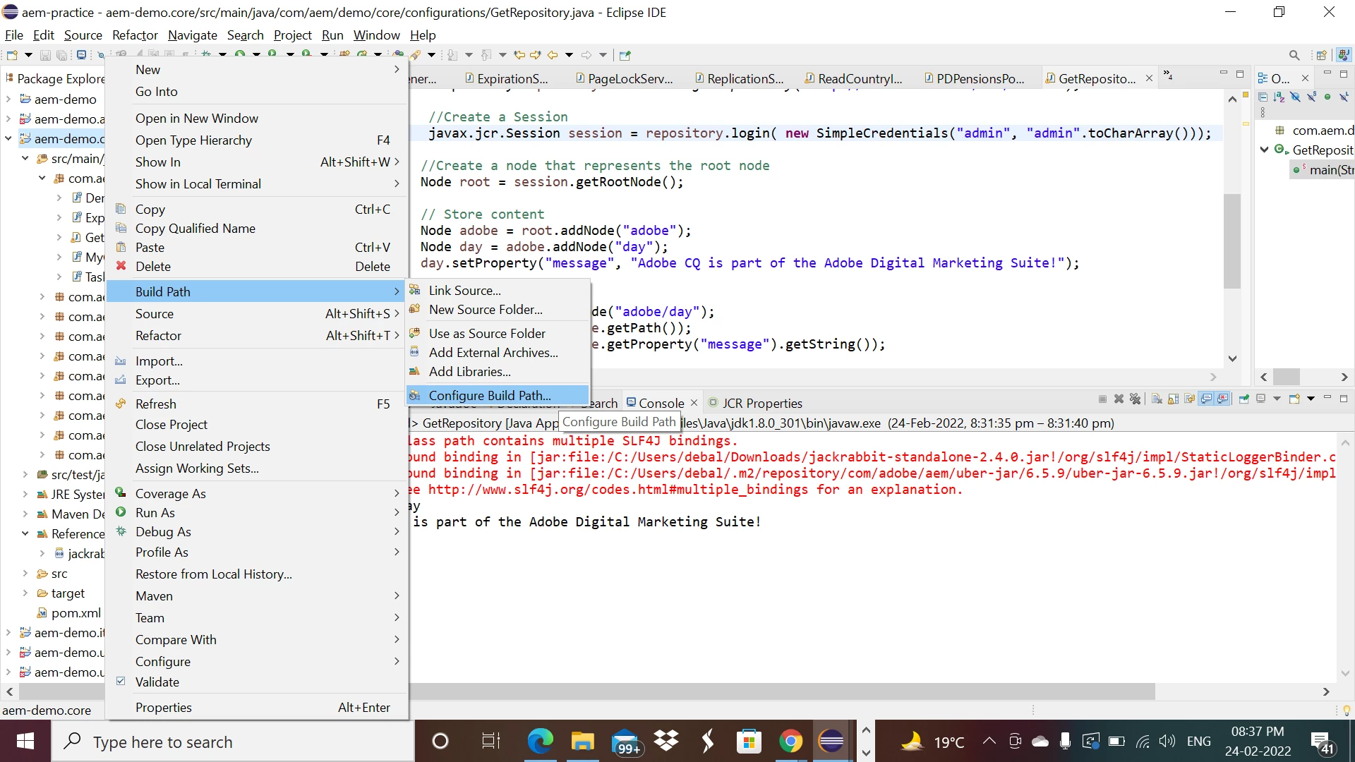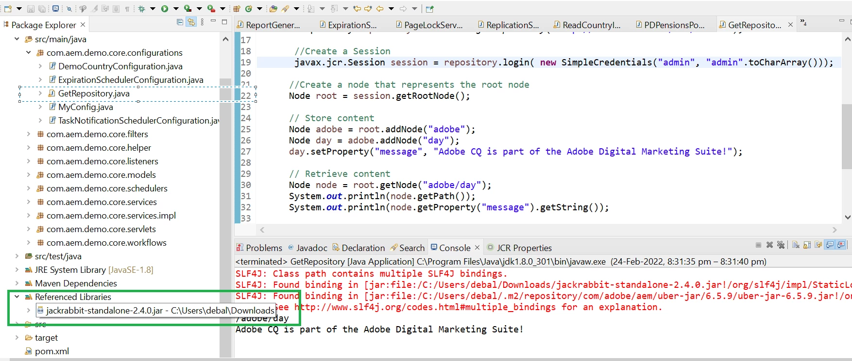Any one could help me in resolving the following issue as I am not able to access the AEM repository using the following code :