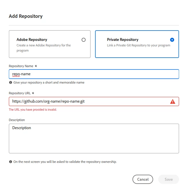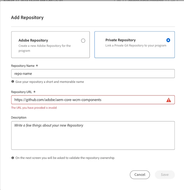 I am trying to add an external repository in cloud manager by going to Repositories > Add Repository > Private Repository. But it seems that whatever url I enter, is considered invalid