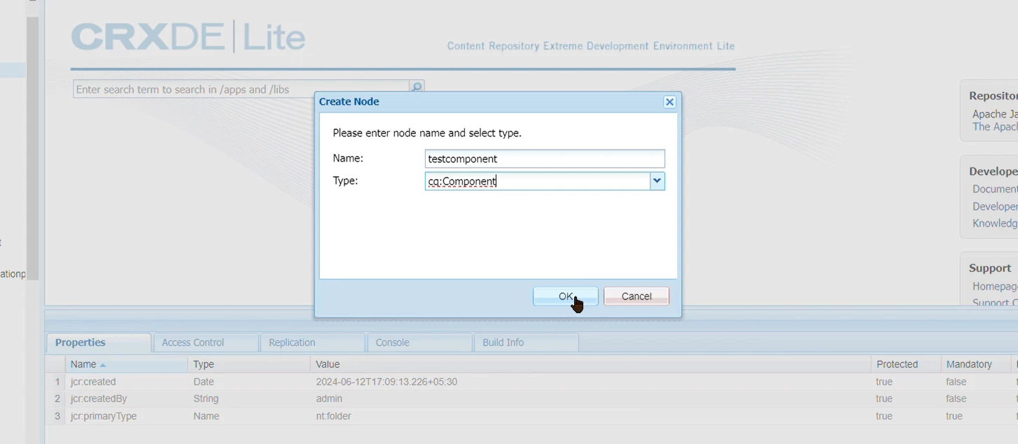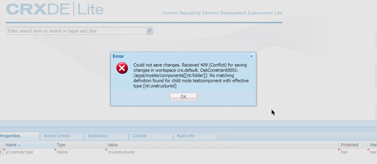 Unable to Create a node with cq:component showing 409