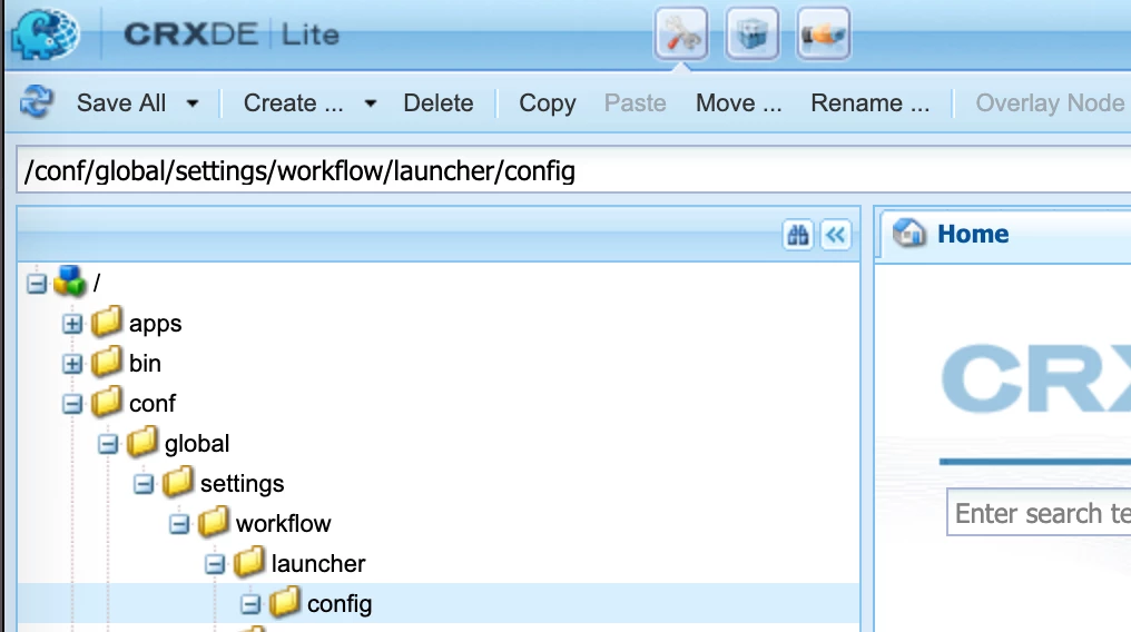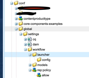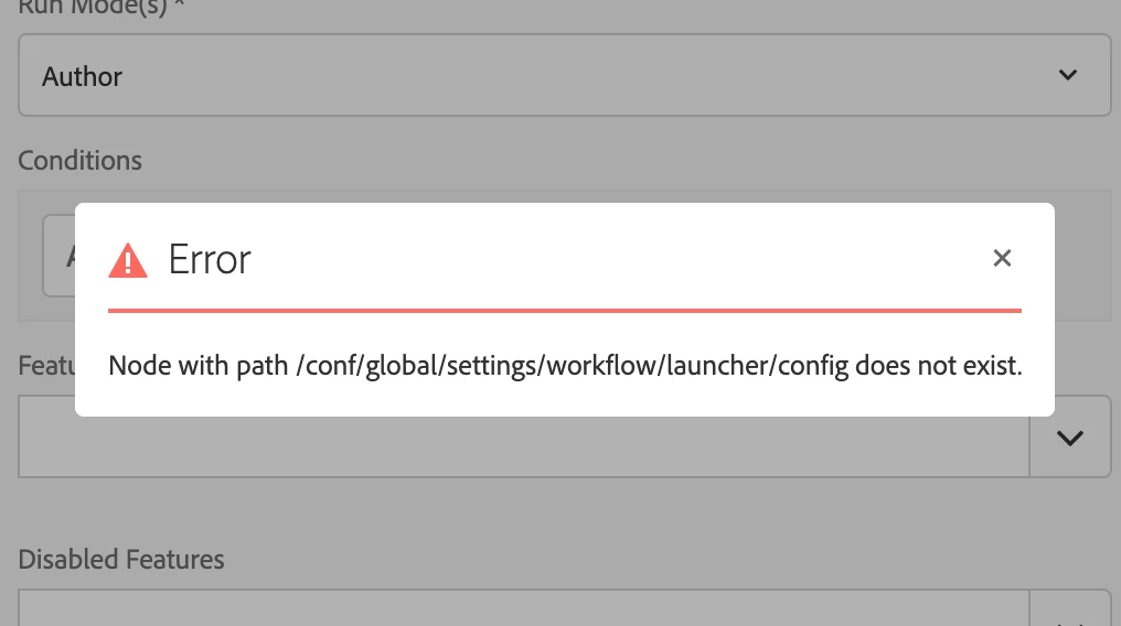 The resolution here is simple, to make sure the sling:Folder structure exists under /conf/global/settings/workflow/launcher/config (illustrated below):