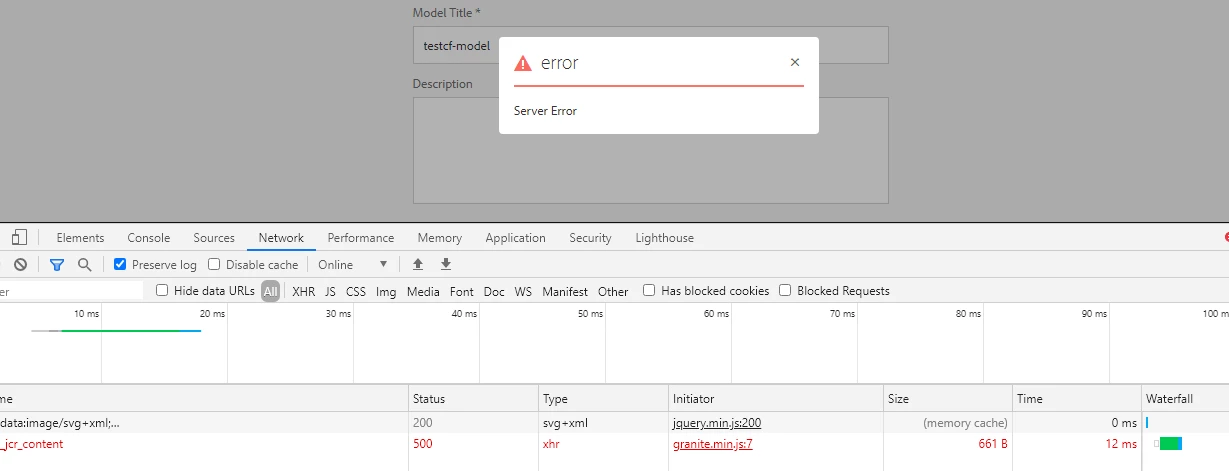 I'm unable to create content fragment model in one of our environments even when i'm logged in with admin. It throws server error.