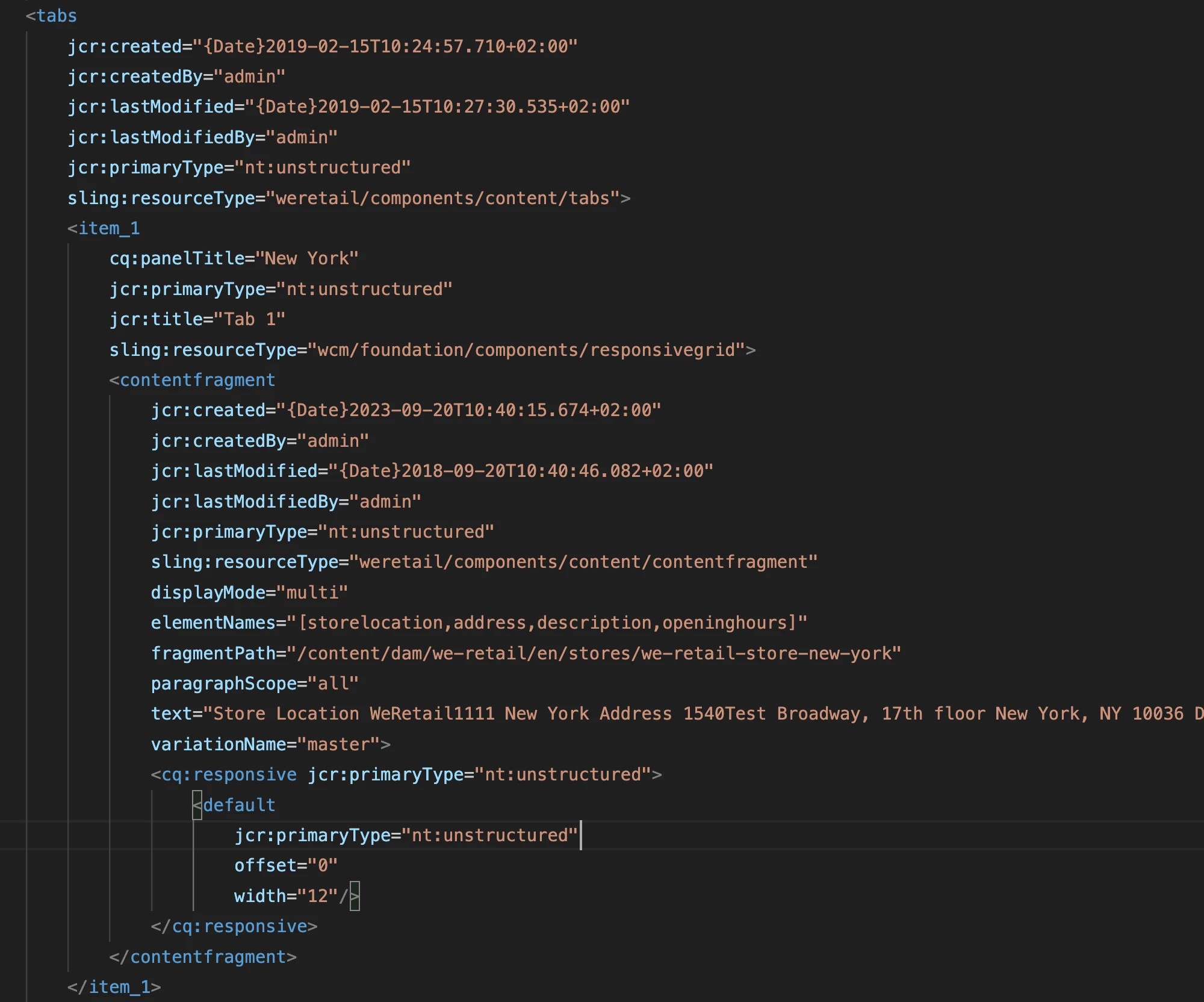 - Updated the content fragment in jcr_root/content/we-retail/language-masters/en/about-us/.content.xml. As you can see in the code snippet attached below, I have updated the text from Store Location WeRetail to Store Location WeRetail1111.