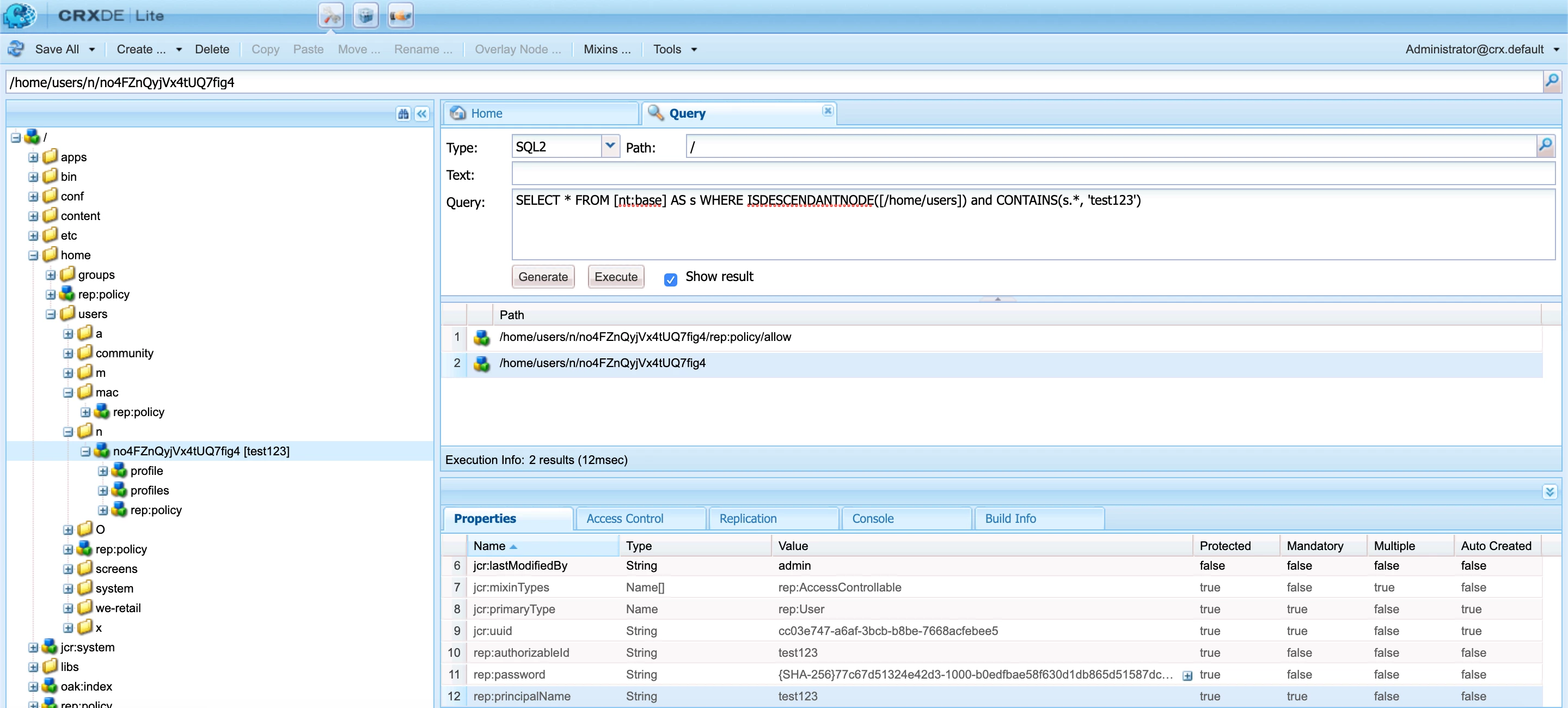 SELECT * FROM [nt:base] AS s WHERE ISDESCENDANTNODE([/home/users]) and CONTAINS(s.*, 'test123')