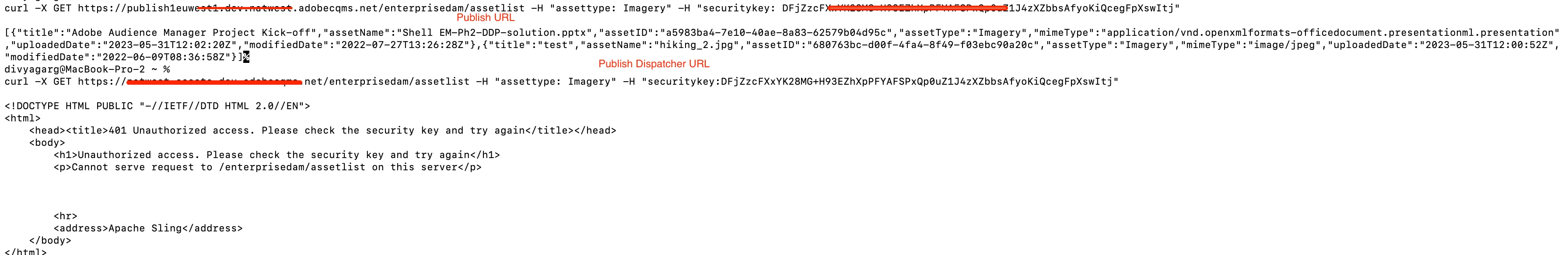 Getting response as expected when hitting 'GET' request on Publisher with request custom headers "securitykey" and "assettype"