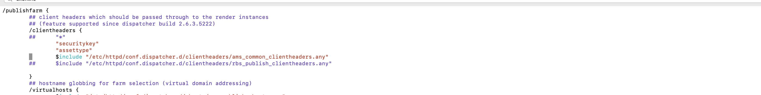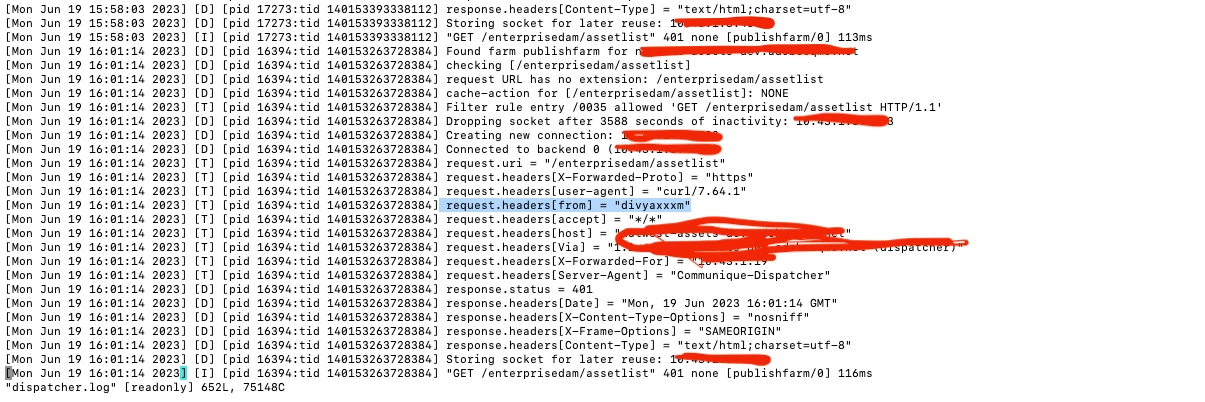 Dispatcher logs - don't see custom request headers in logs like securitykey or assettype although I am sure right farm file and client header file is getting picked . Log is already set to trace.