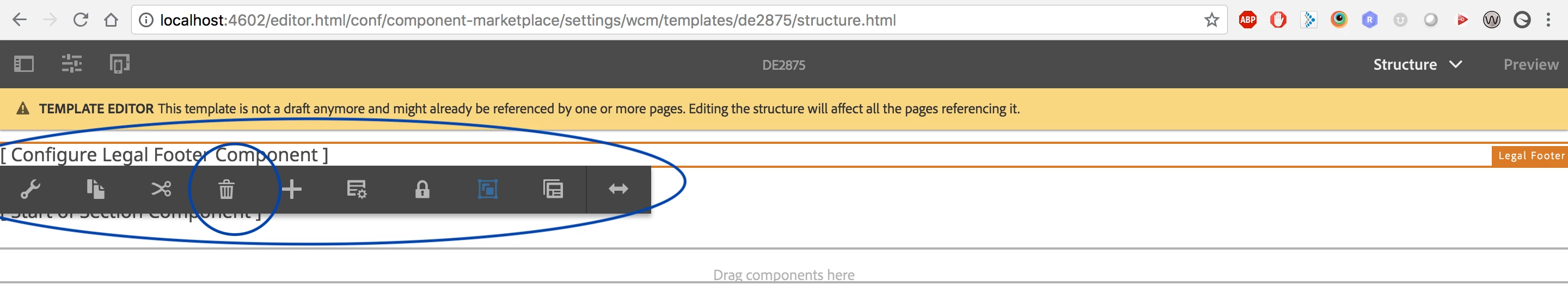 If we do not have any referencing content within structure components via data-sly-resource using the @ resourceType option we are seeing the trash icon like shown below.