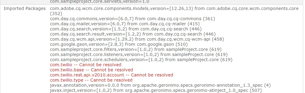 age(s) [com.twilio.type, com.twilio, com.twilio.rest.api.v2010.account, com.twilio.base] in start level 20 but no bundle is exporting these for that start level. (com.sampleproject:sampleProject.all:1.0.0-SNAPSHOT)