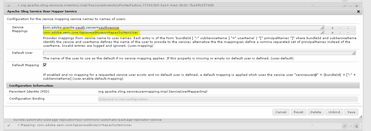 I was trying to access a specific resource from my Servlet. Before that I created a system user, then added permission to that user to a specific node. But I think I did a mistake while configuring the user in system console User Mapper Service due to which I am unable to retrieve instance of Resource from ResourceResolver. Please find the screenshot for further info.