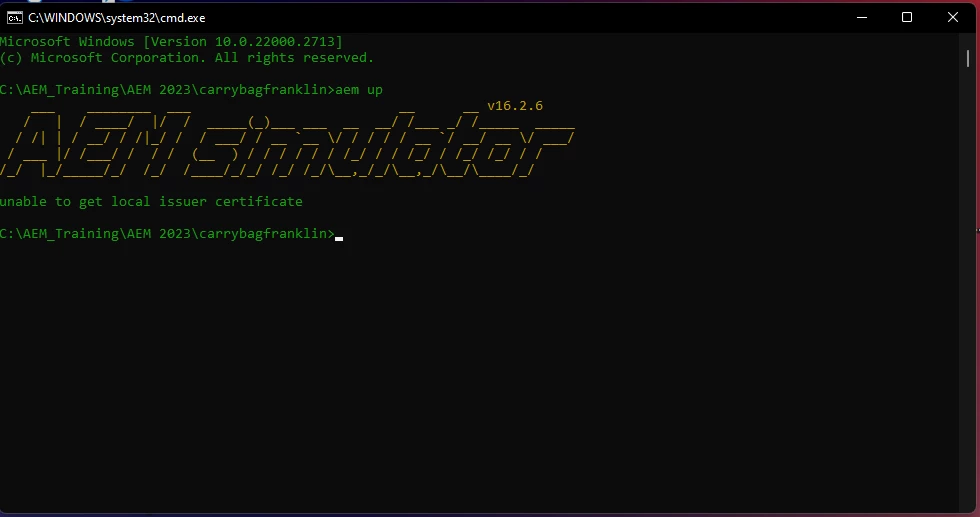 While setting up the local envirinment for aem franklin, I'm unable to run the aem using the aem up command its throwing the error "unable to get local issuer certificate" which is attached below, kindly give suggestion to resolve this error.