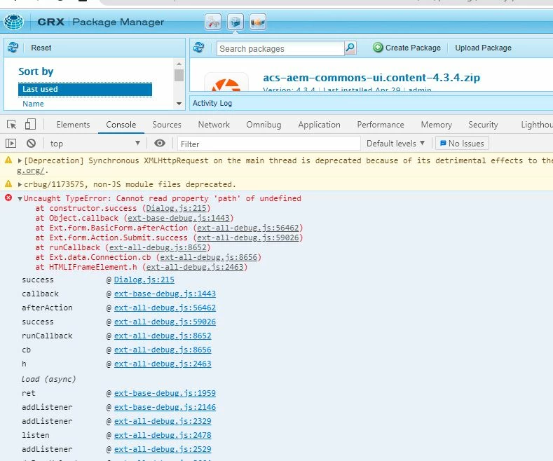 Hello, While uploading the bundle package I am getting error "Cannot read property path of undefined" on browser's console. Any idea why I am seeing this? although I am able to deploy the same code on my local and also using maven parameter autoInstallPackage.