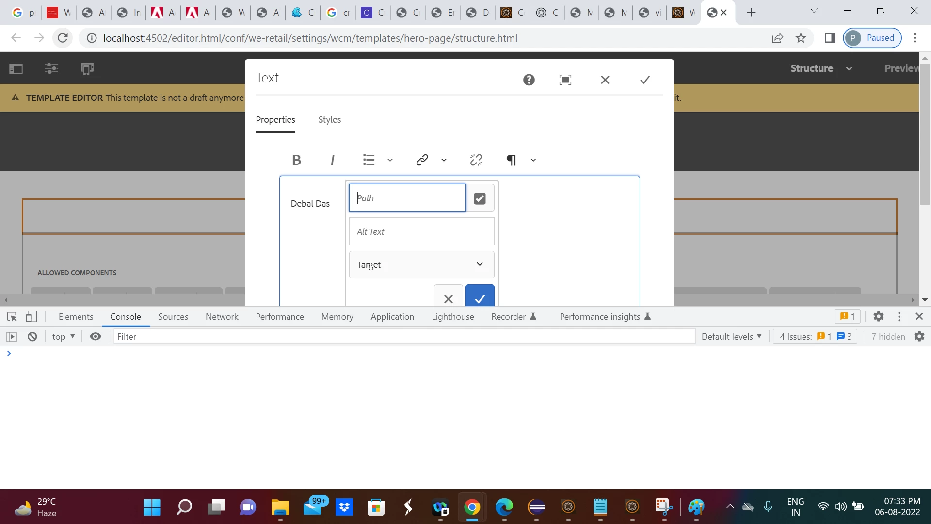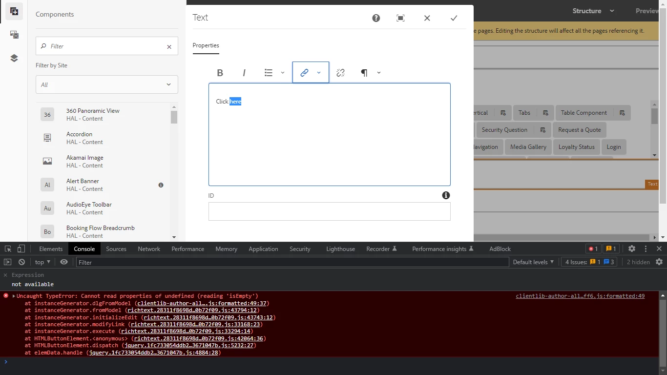 I have RTE for a text field and it is working fine on the page but when adding the same component in Structure of the template. and below are the errors in the console logs.