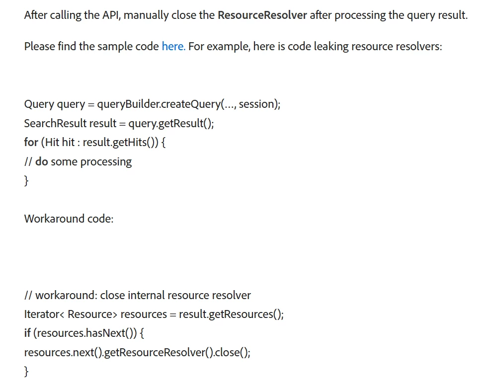 I am dealing with unclosed resource resolver warnings and working on solutions to fix this. In the process I came across this article - https://experienceleague.adobe.com/en/docs/experience-cloud-kcs/kbarticles/ka-23761#