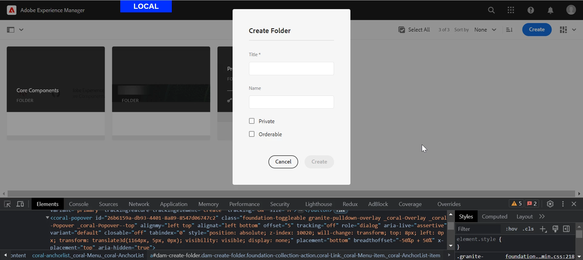 Recently, I noticed that I can't create a folder within assets. When I click on "Create folder," a redirection to the home page is triggered.