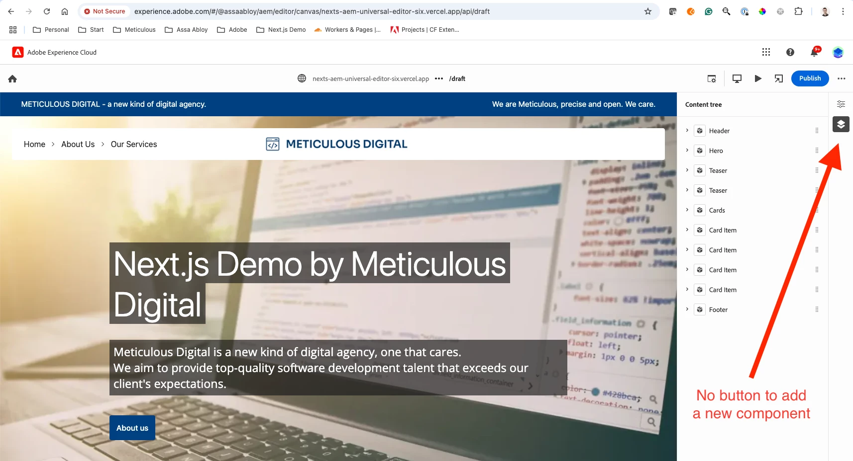 I am doing a demo with Universal Editor and my local AEMaaCS instance. Most things work pretty well, but I cannot figure out why there is no button to "add a new component".