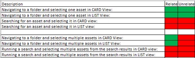 Unrelate option visibility issue : Scenarios: 1] Navigating to a folder and selecting multiple assets in CARD View: 2] Navigating to a folder and selecting multiple assets in LIST View: 3] Running a search and selecting multiple assets from the search results in CARD view: 4] Running a search and selecting multiple assets from the search results in LIST view: