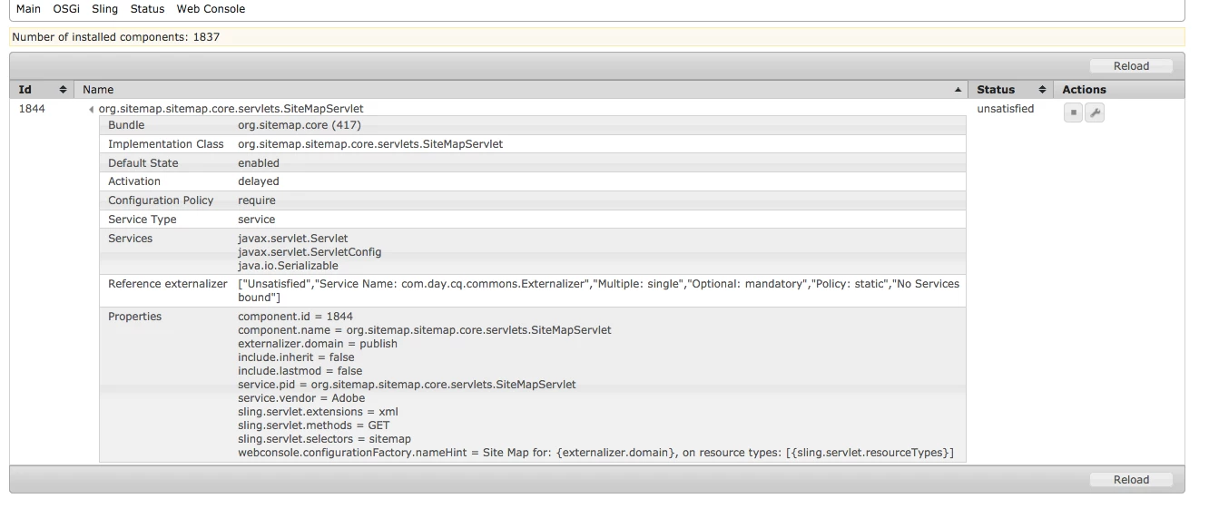 Reference externalizer["Unsatisfied","Service Name: com.day.cq.commons.Externalizer","Multiple: single","Optional: mandatory","Policy: static","No Services bound"]