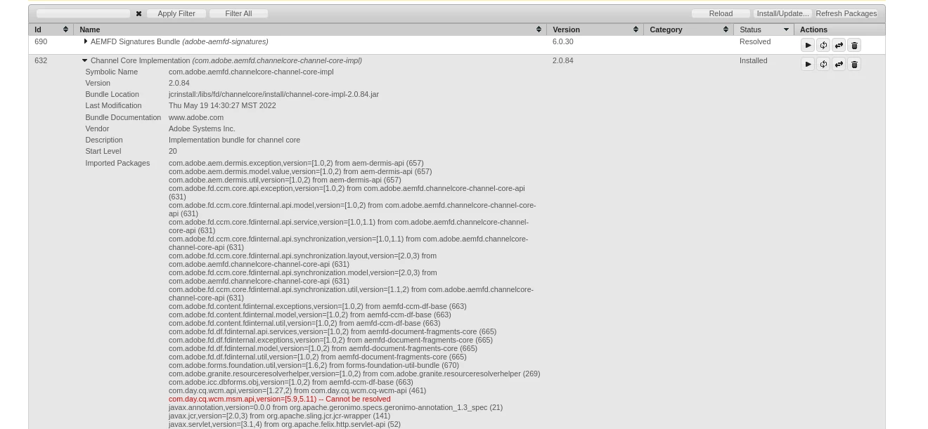 14.09.2023 13:50:00.341 *ERROR* [FelixStartLevel] ERROR: Bundle '632' Error starting jcrinstall:/libs/fd/channelcore/install/channel-core-impl-2.0.84.jar (org.osgi.framework.BundleException: Unable to resolve com.adobe.aemfd.channelcore-channel-core-impl [632](R 632.0): missing requirement [com.adobe.aemfd.channelcore-channel-core-impl [632](R 632.0)] osgi.wiring.package; (&(osgi.wiring.package=com.day.cq.wcm.msm.api)(version>=5.9.0)(!(version>=5.11.0))) Unresolved requirements: [[com.adobe.aemfd.channelcore-channel-core-impl [632](R 632.0)] osgi.wiring.package; (&(osgi.wiring.package=com.day.cq.wcm.msm.api)(version>=5.9.0)(!(version>=5.11.0)))])