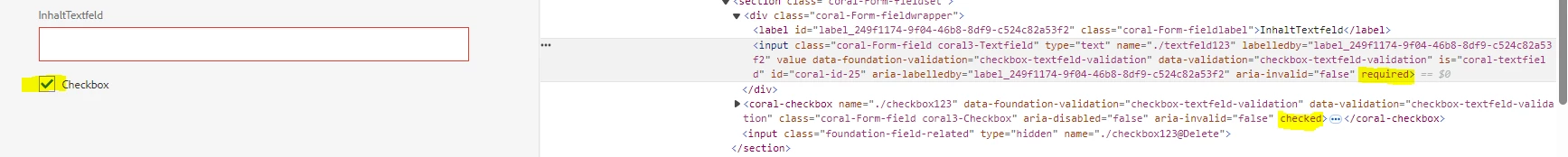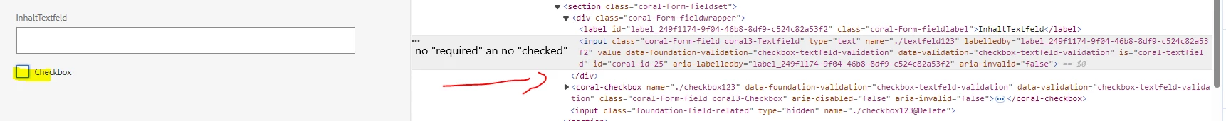 The validation works I can see that the required textbox changes if I check or uncheck the checkbox. That meens the red corner appears and diappears and in the HTML I see the "required".