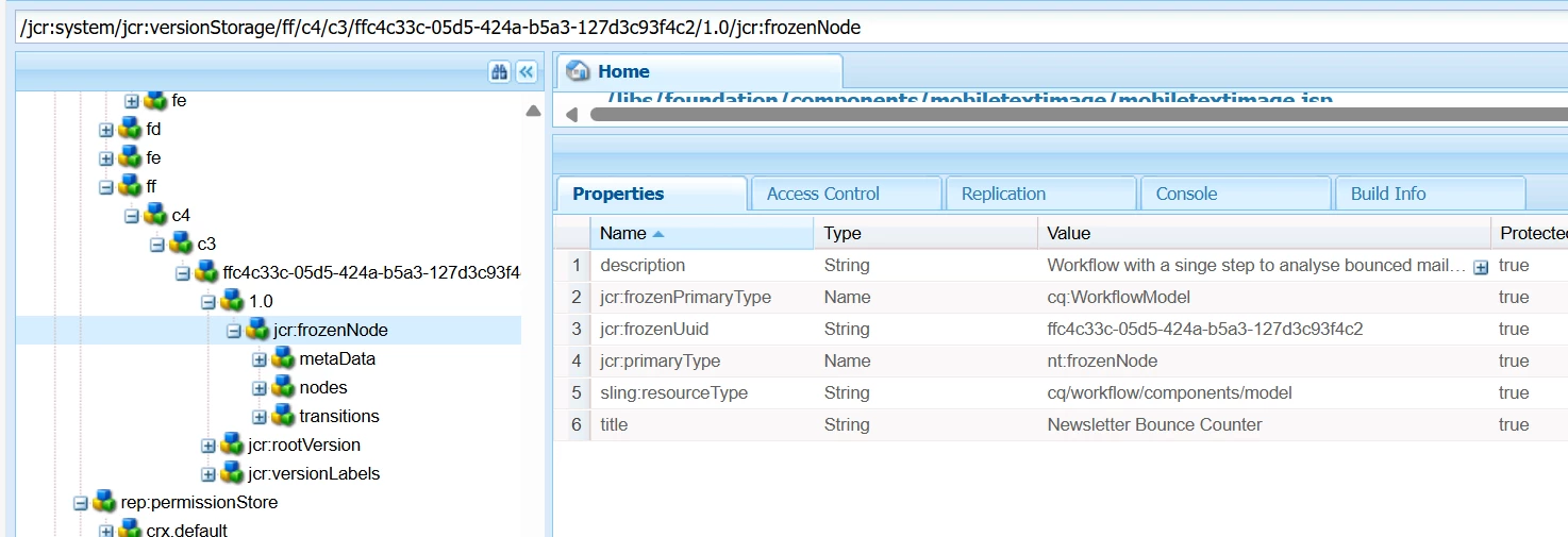 What are the jcr:frozenNode and nt:frozenNode in the CRX repository? And versioning error during replication in Workflow