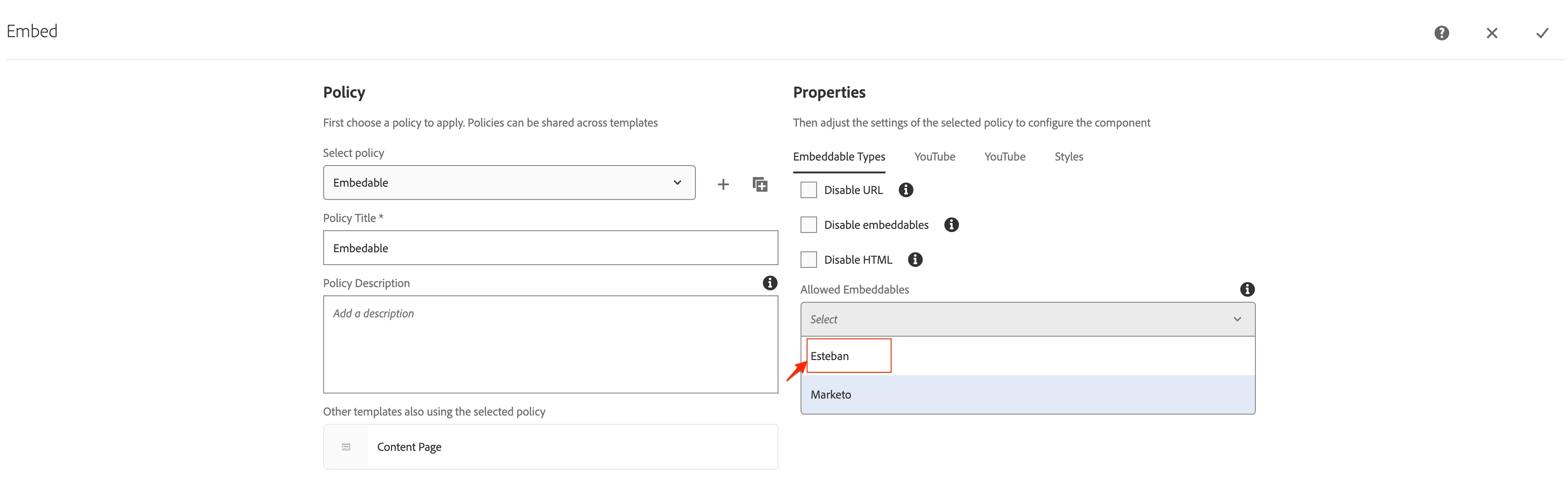 when I open the dialog for the Embed component, I am unable to see the newly added embeddable listed in the drop-down menu under the 'Allowed Embeddables' section