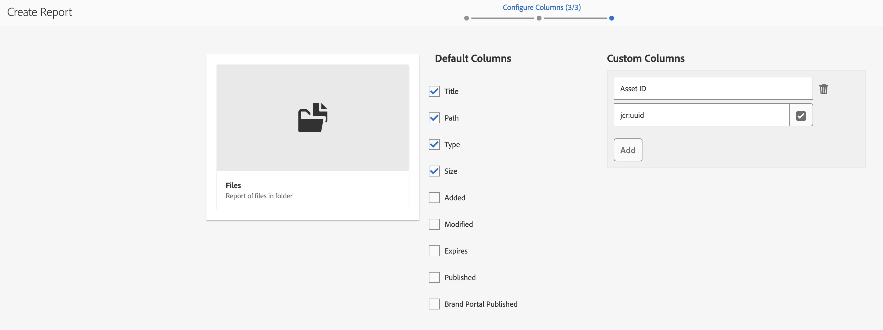 The next screen allows to add custom columns, in that you can select the jcr:UUID for Asset ID column and generate report.