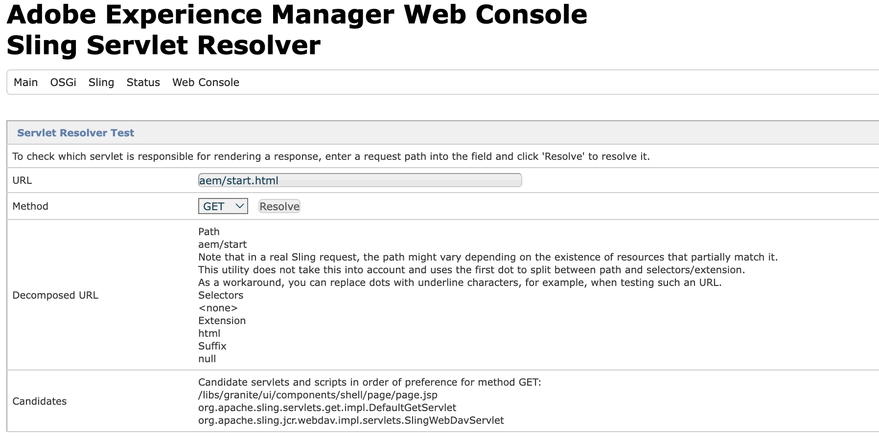 When you hit /aem/start.html below are the servlets and script will execute in order of preference for method for given method: