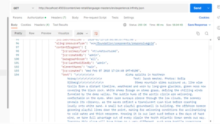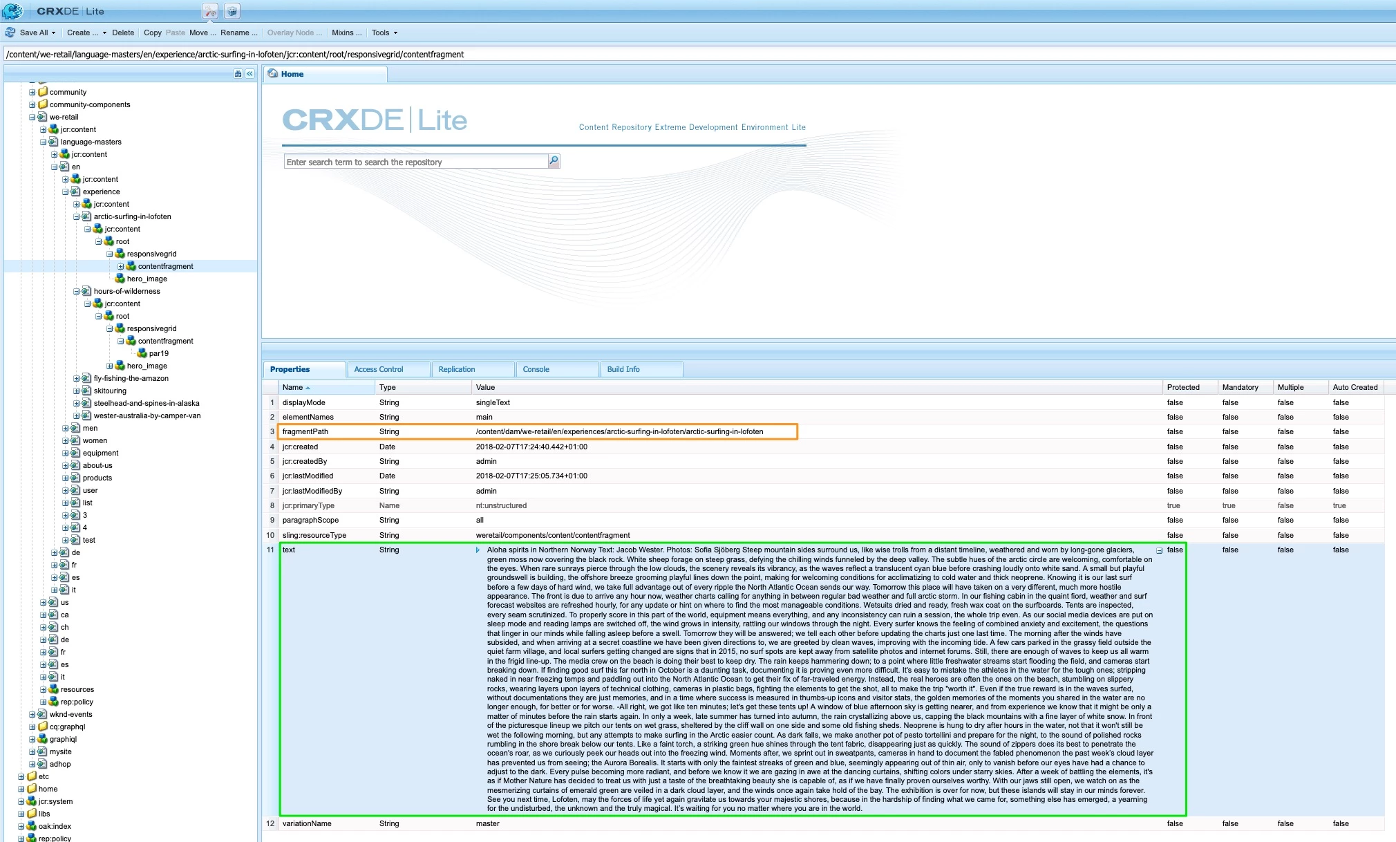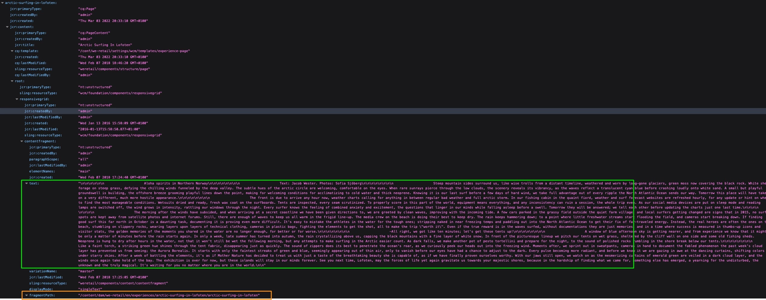 It is not content that is part of this specific page it is content of following CF /content/dam/we-retail/en/experiences/arctic-surfing-in-lofoten/arctic-surfing-in-lofoten which is referenced on the page via Content Fragment component.