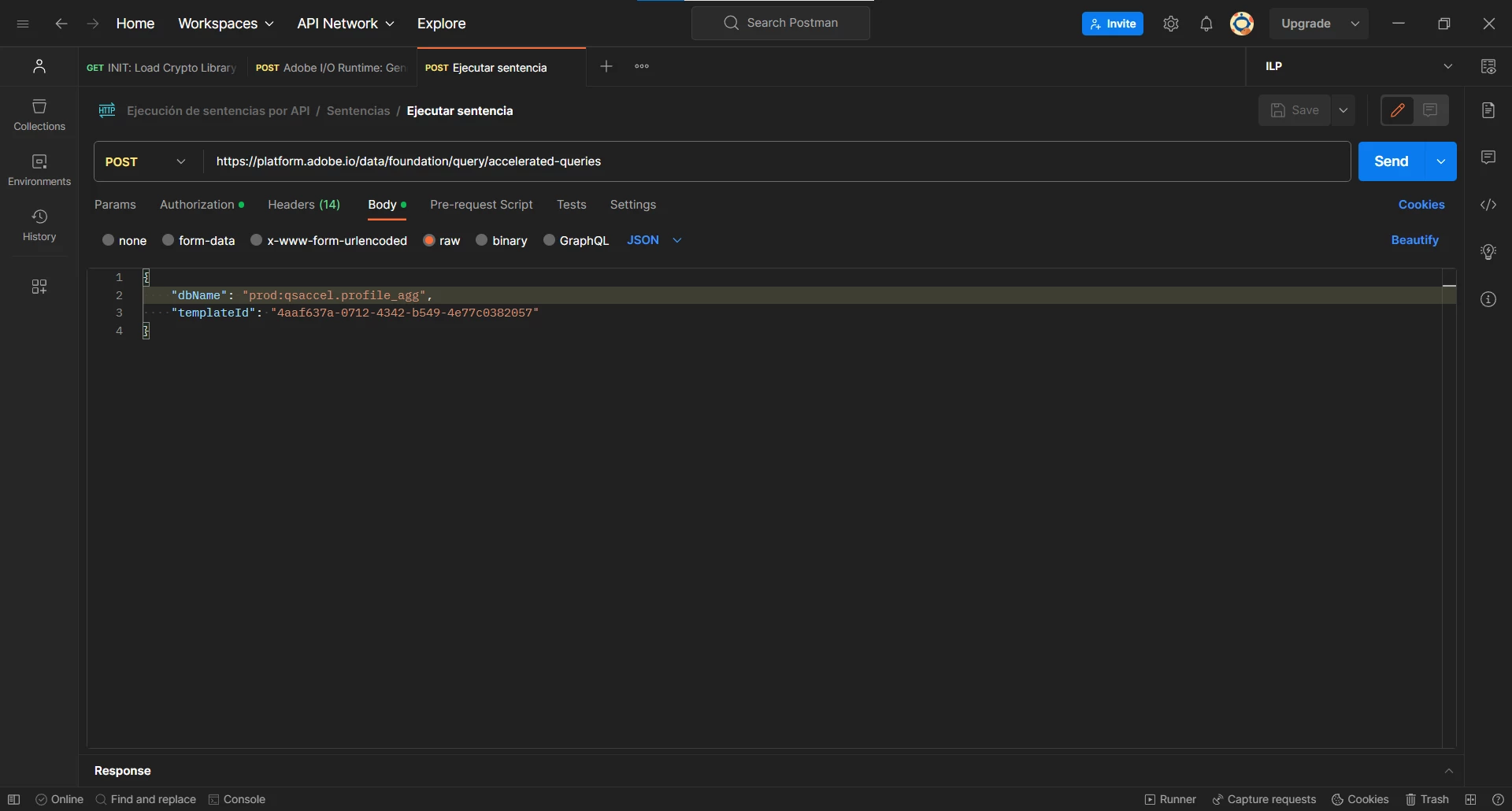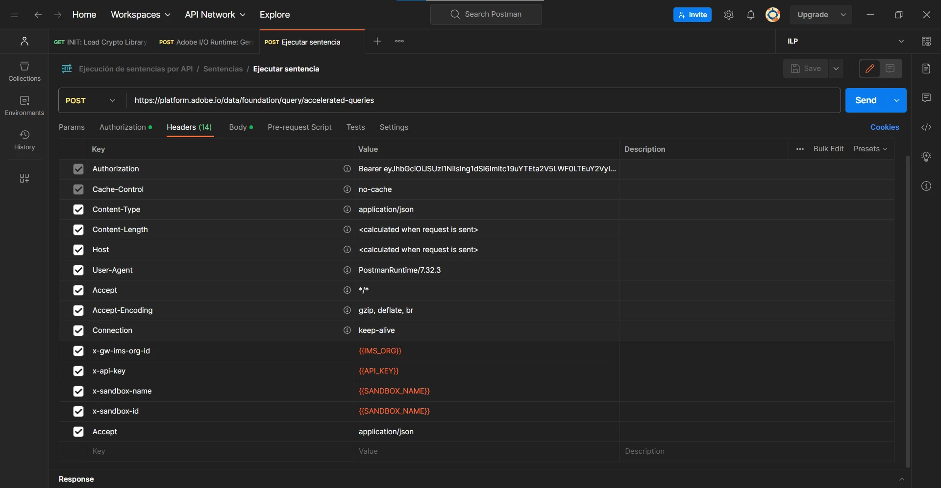 I want to execute the statement using the Accelerated Queries API endpoint on Postman, so I follow the Accelerated Queries API Endpoint Doc.