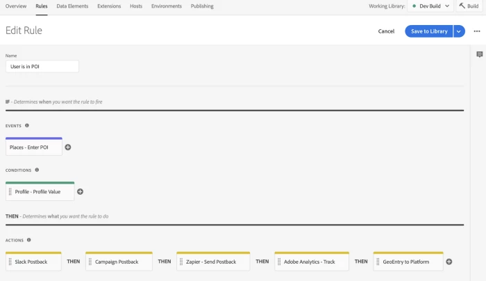 One of the main benefits of using Adobe Experience Platform Launch to manage your mobile SDK implementation is the ability to create both simple and complex workflow rules. You can define what events and or conditions you want to trigger an action and then deploy these new rules to your application dynamically. Because your application maintains a live-link to your Launch environments you can easily add or modify rules depending on your needs.