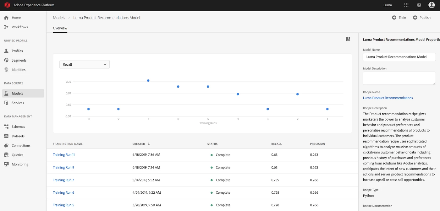 We knew that data scientists wanted increased efficiency and flexibility while authoring a recipe, so we provided three options: create, import, or use a pre-built recipe created by Adobe and partners.