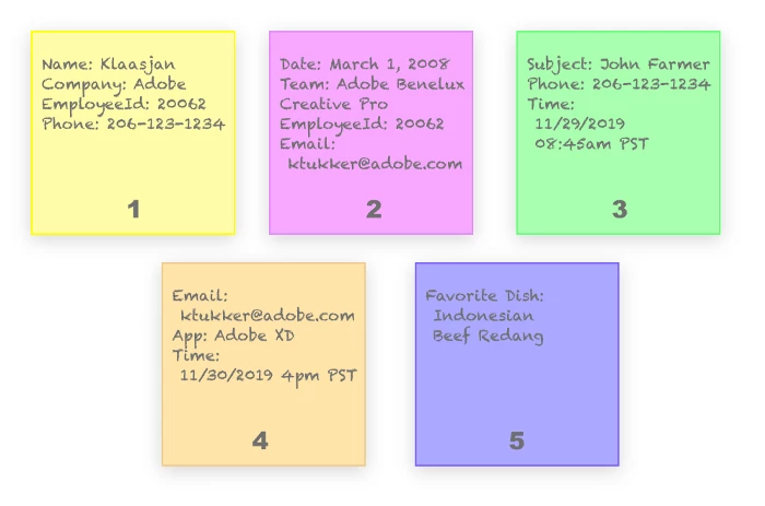 Thank you for asking. This is where a probabilistic linking in an Identity Graph comes in. In this example, as you probably noticed, there was no identifier on the blue sticky note that contained the favorite dish. However, when analyzing all data that is brought into the Real-Time Customer Profile, the system could analyze the hand-writing and correlating the handwriting on the individual sticky notes. As a result, the following segment could be built by using a probabilistic (handwriting-analysis based) graph: "All individuals who like 'Indonesian Beef Rendang' and joined Adobe before 2010". The segment would contain at least one member: Klaasjan – Terima Kasih!