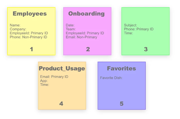 - Employees: List of employees, phone number, name and company name. In Experience Platform, this dataset would be structured according to the "XDM Individual Profile" Schema from Experience Data Model.