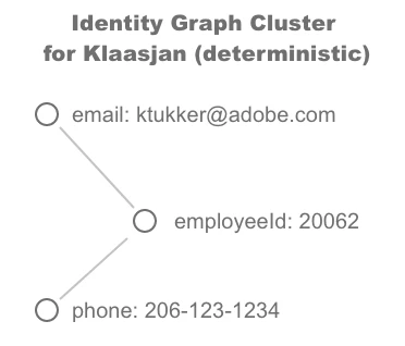 As data is being read into the real-time Customer Profile an Identity Graph is constructed in parallel, recording the identifiers that are available in the datasets and the relationship between them. Below you see the actual identifiers for each dataset: